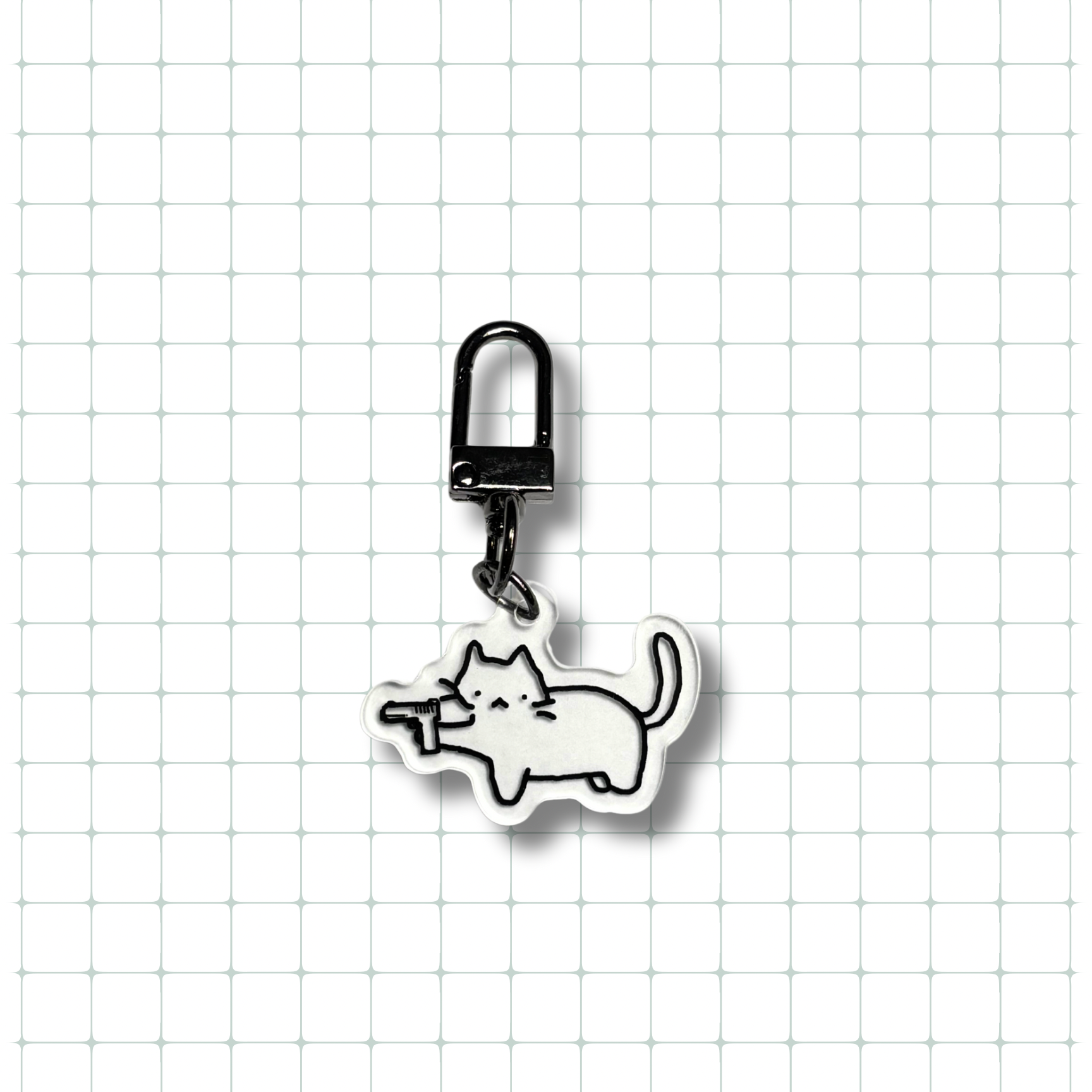 1"x1.5" acrylic cat with a gun keychain with a metal clasp